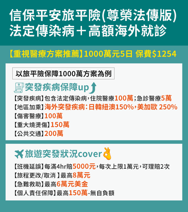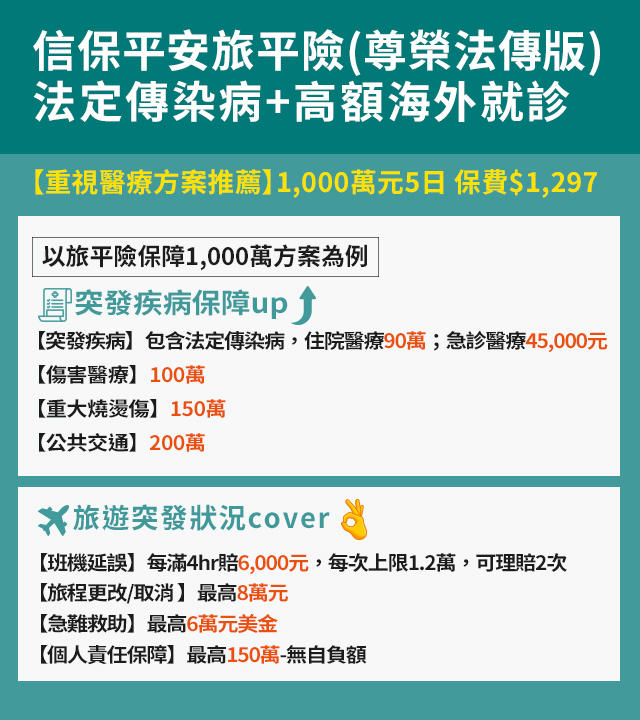 【加值服務】在海外旅遊保期內,可享中信產險提供的免費「Fun心Care醫療諮詢服務」乙次。(活動詳情請詳中信產險官網)