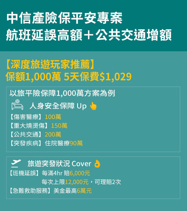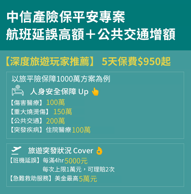【加值服務】在海外旅遊保期內,可享中信產險提供的免費「Fun心Care醫療諮詢服務」乙次。(活動詳情請詳中信產險官網)
